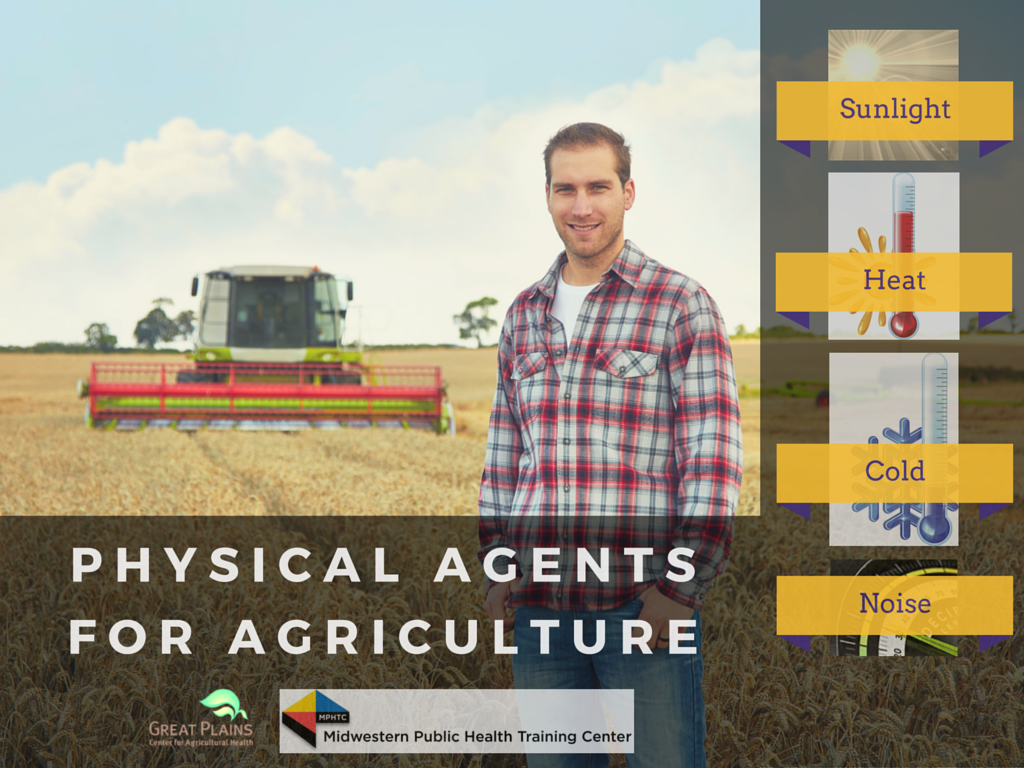 - Describe some of the physical agents to which agricultural workers are exposed: sunlight (non-ionizing radiation), heat stress, cold stress, and noise.